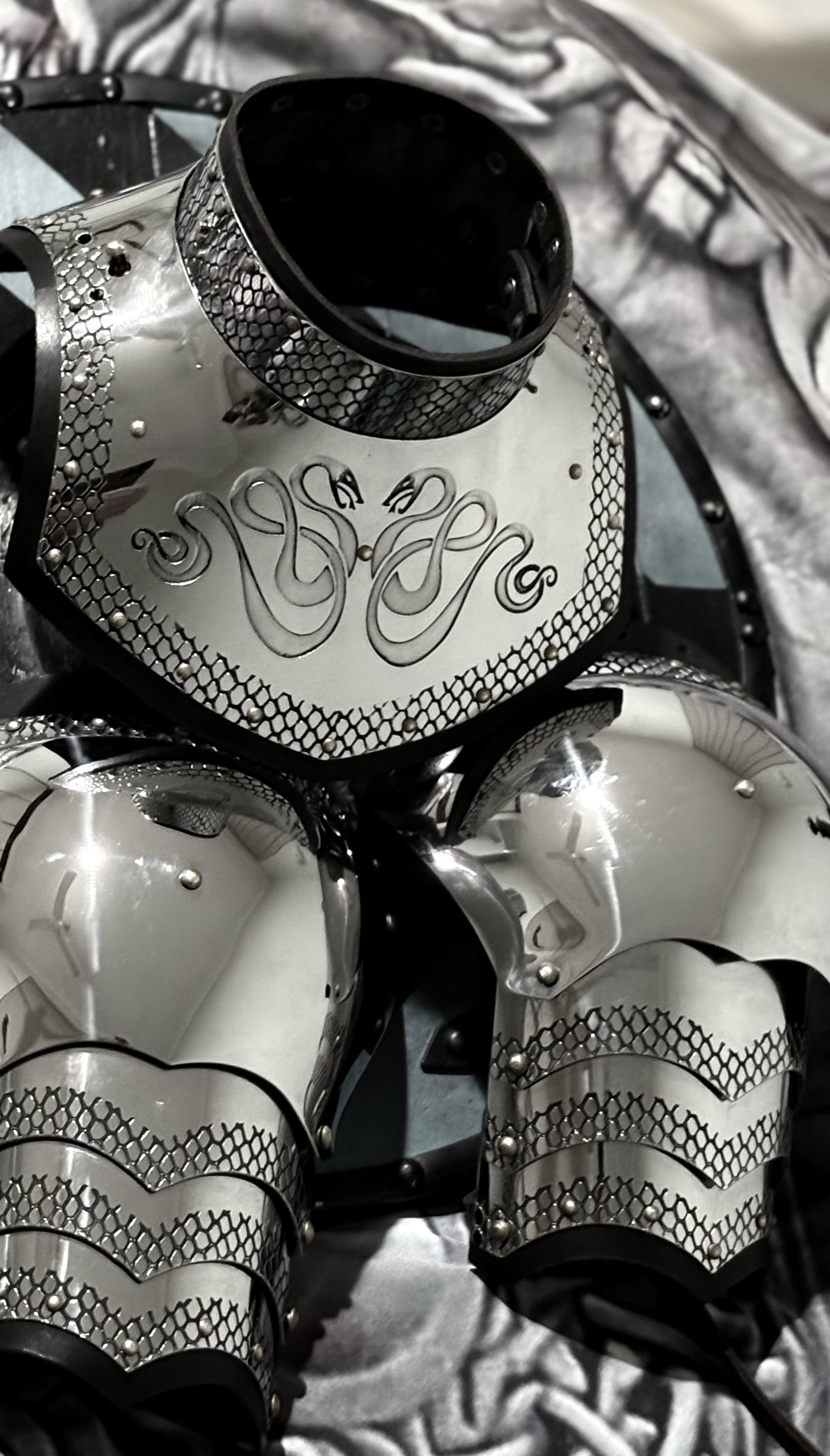 Great quality original pauldrons and gorget. Leather and stainless steel etched plates. Beautiful and very protective functional armor set.