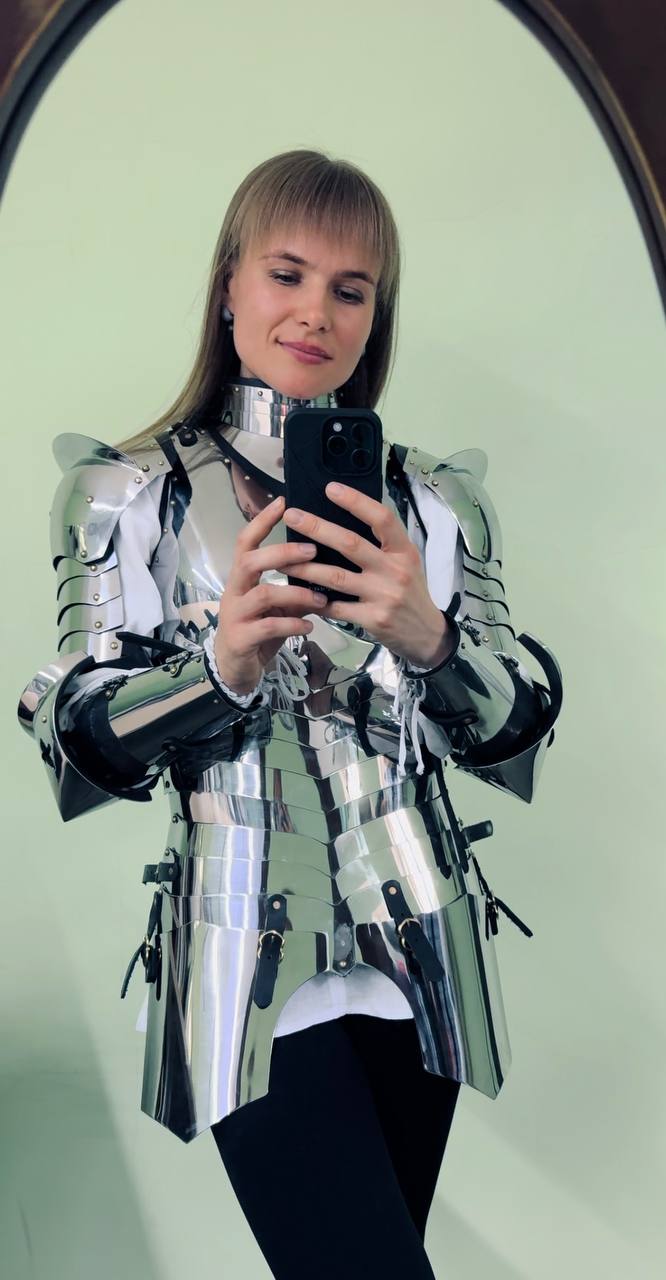 Our “Morning Star” collection is a sleek new set of armor optimized for the female figure. We’ve taken into account the curves of the body to create something that looks utterly amazing without sacrificing practicality or comfort. Light and easy to move in, it’s designed to make the wearer feel armored but not encumbered and aims to empower and protect. The set features shiny silver steel as well as brassed accents.