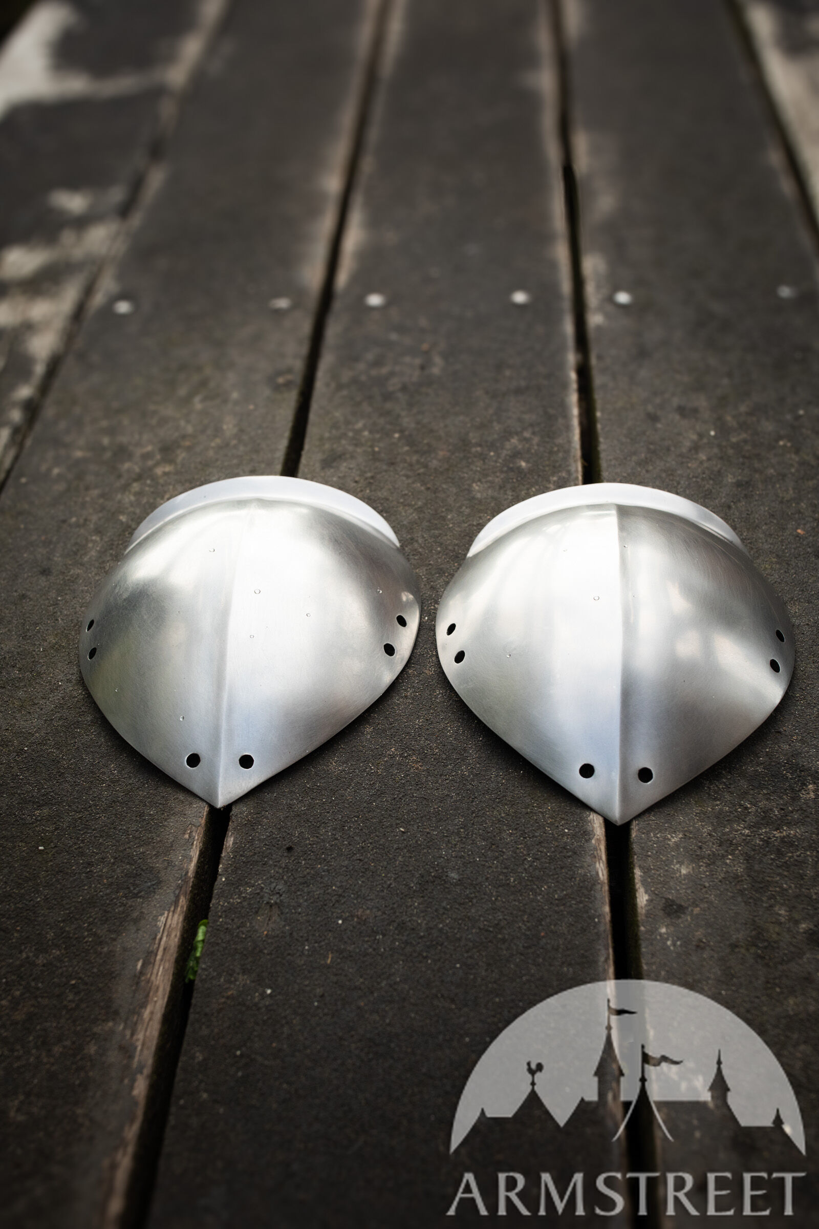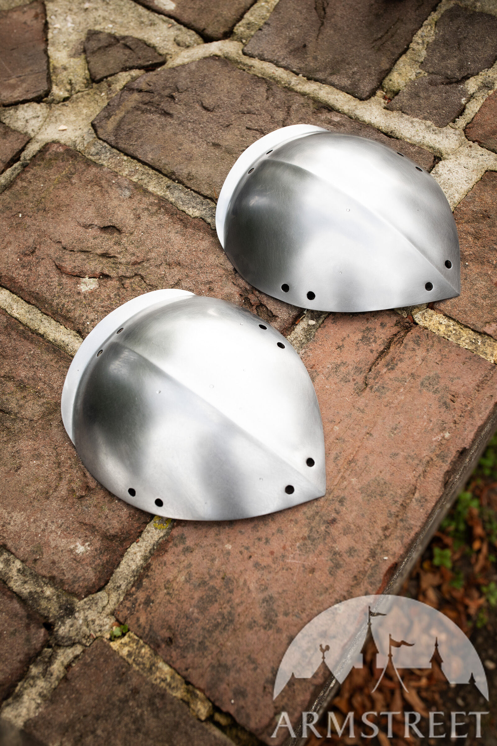 These pauldrons are the simplest option out of all our other shoulder guards. They are simple, have lacing holes all over the edges for bands lacing to the gambeson or HEMA jacket, and are made of hardened spring steel by default, making them quite light and comfortable. You’ll likely stop noticing them after a couple of test fights. Check out the blackened (or brass goldened) pauldrons version here.