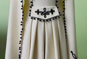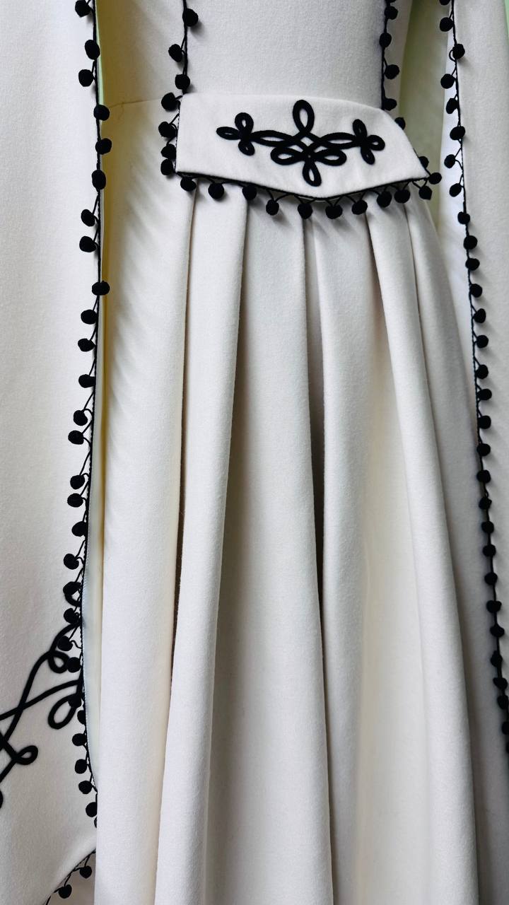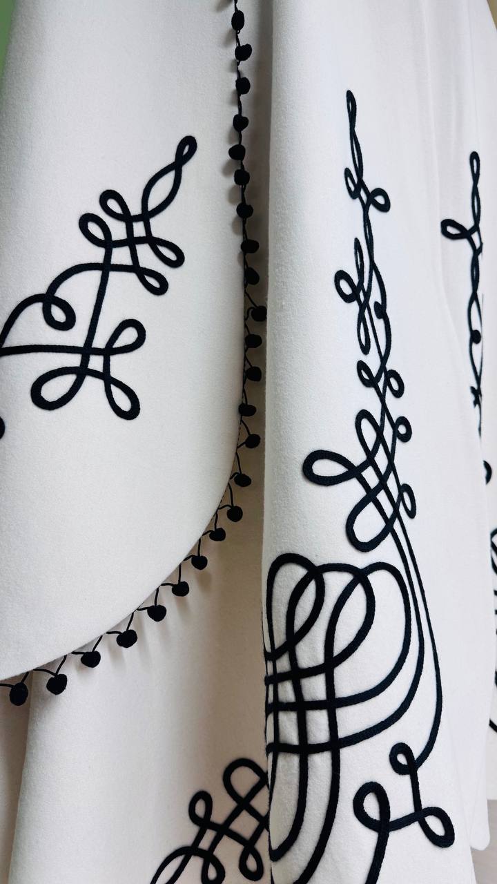 What really sets this coat apart is the materials. Historical textiles have been used where possible, with some more modern touches coming in to finish it off. The majority of this coat is made from wool that drapes incredibly and will provide you with some water resistance. Around the neckline, you’ll find faux-fur to give you more warmth as well as a touch of luxury. The Machu influence comes in with the details - the toggles along with the decorations on the bottom, back and sleeves are embellished with beads. Pom-pom like trim is used as well along the sleeves and back of the dress which continues these motifs. Satin lining is used throughout to ensure that the coat slips on and off easily, as well as creating a shiny texture that contrasts with the flat wool.