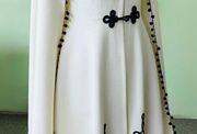 This coat combines elements of Manchu clothing and Balkan designs in a way that is flattering with our signature ArmStreet twist. It is meant as an outer layer and is slim-fitted like many items of later European garb. It is tapered in at the waist before flowing out in a series of generous pleats at the back and gores at the front, giving you lots of room to walk and plenty of insulation on cold nights. We have made this coat with toggles in the middle to keep in closed, as well as added hooks as a safeguard so you don’t have to worry about it tearing open in the wind. Beautiful long sleeves give this coat a formal gown-like appeal, falling gracefully to just below your knees. The sleeves afford this garment a certain presence that will no doubt attract attention and make it clear that you are a person to be taken seriously.