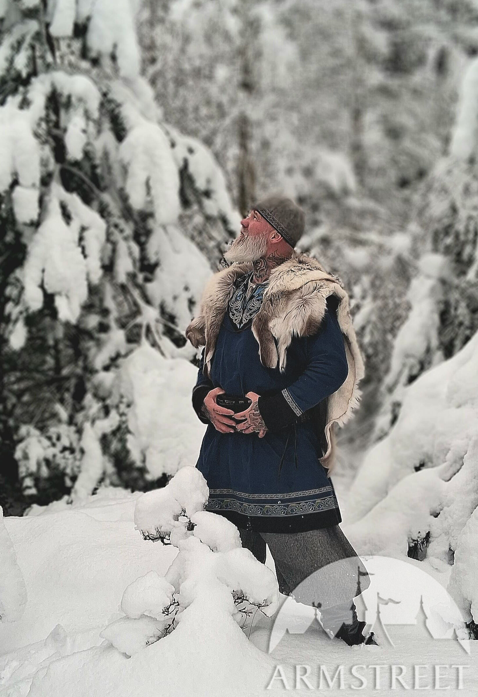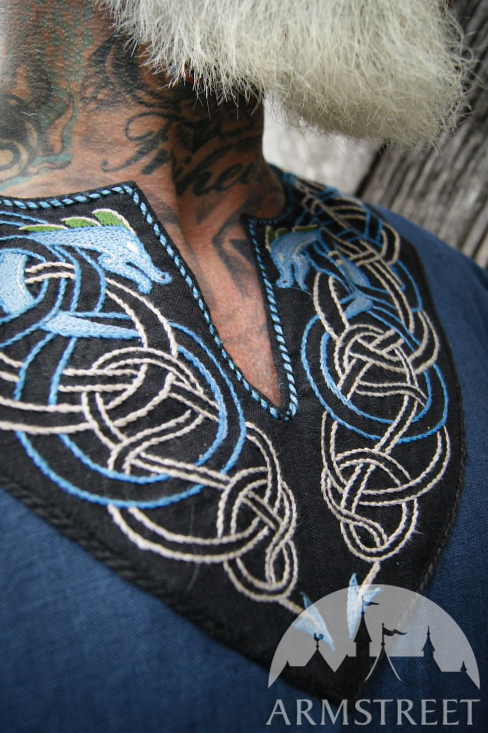 Like many ancient people, the Vikings also saw clothes as having particular meaning. They considered the human's throat a crucial part of the body because they believed it was where the soul leaves when a person passes away. Hence, the Vikings paid extra attention to decorating the neck opening of their clothing. Following this tradition, we adorned the neckline of this tunic with hand embroidery. This type of finishing replicates the techniques used in the past, particularly the Norman embroidery style. Although it requires a lot of effort, the result is impressive and authentic – the mythical creatures guard your neck both at the front and back. The embroidered dragons at the neckline complement the pattern on the trim. The entire neckline and edge of the calves are hand-finished with a thick thread that twists around the rope in tiny stitches, giving evil spirits no chance to get close to you.