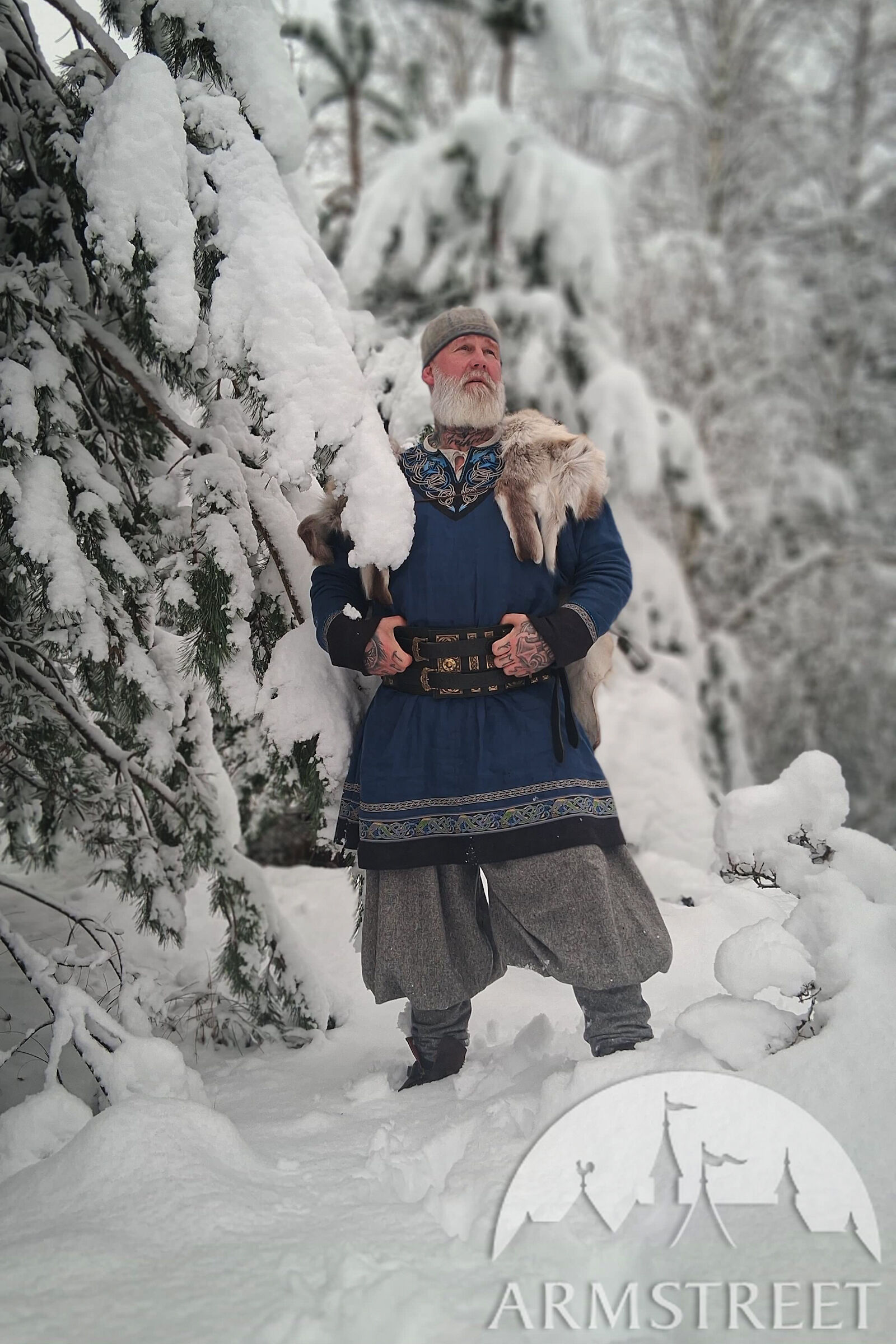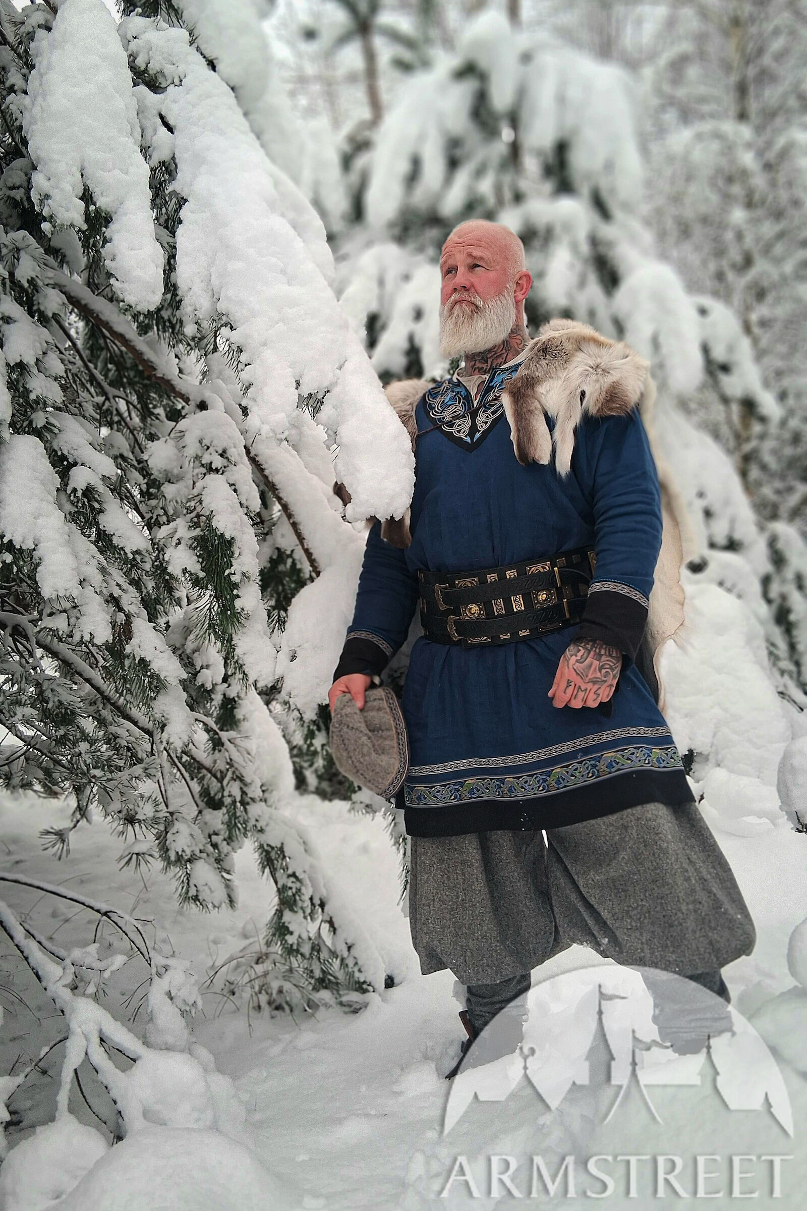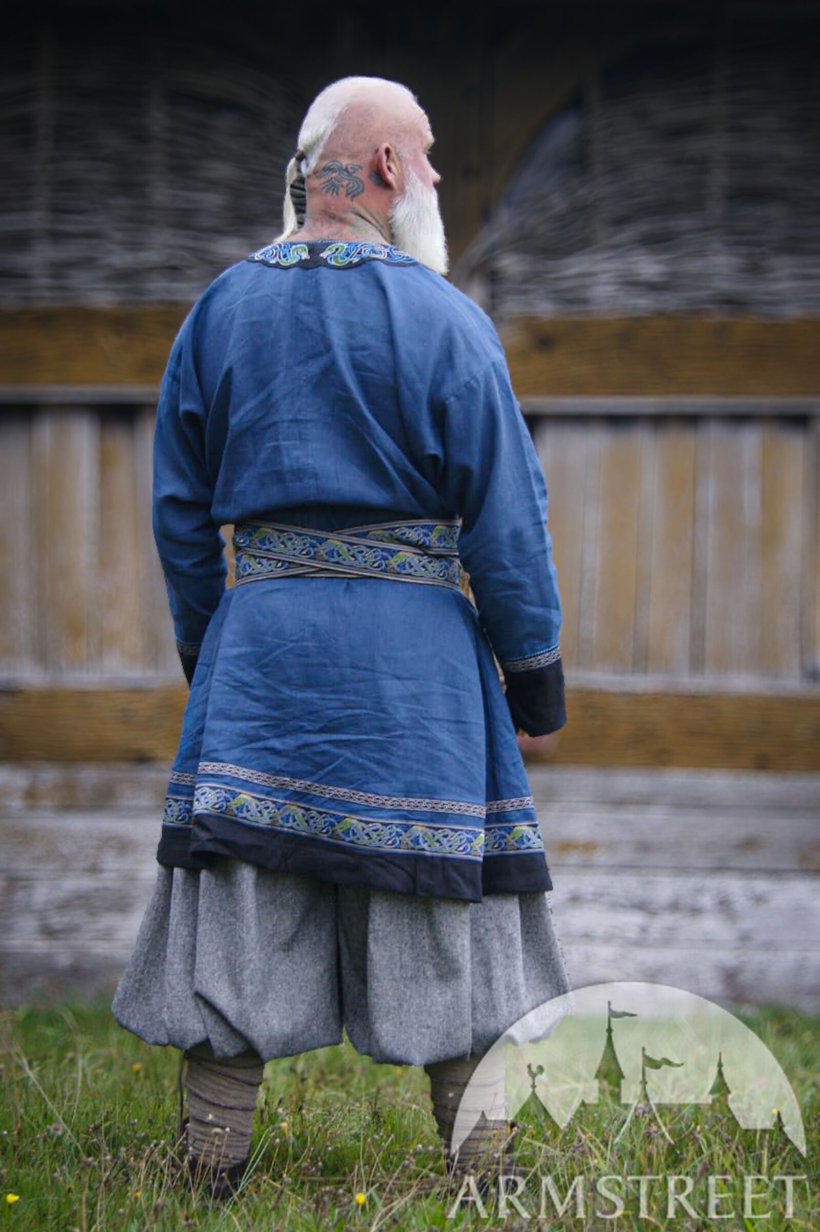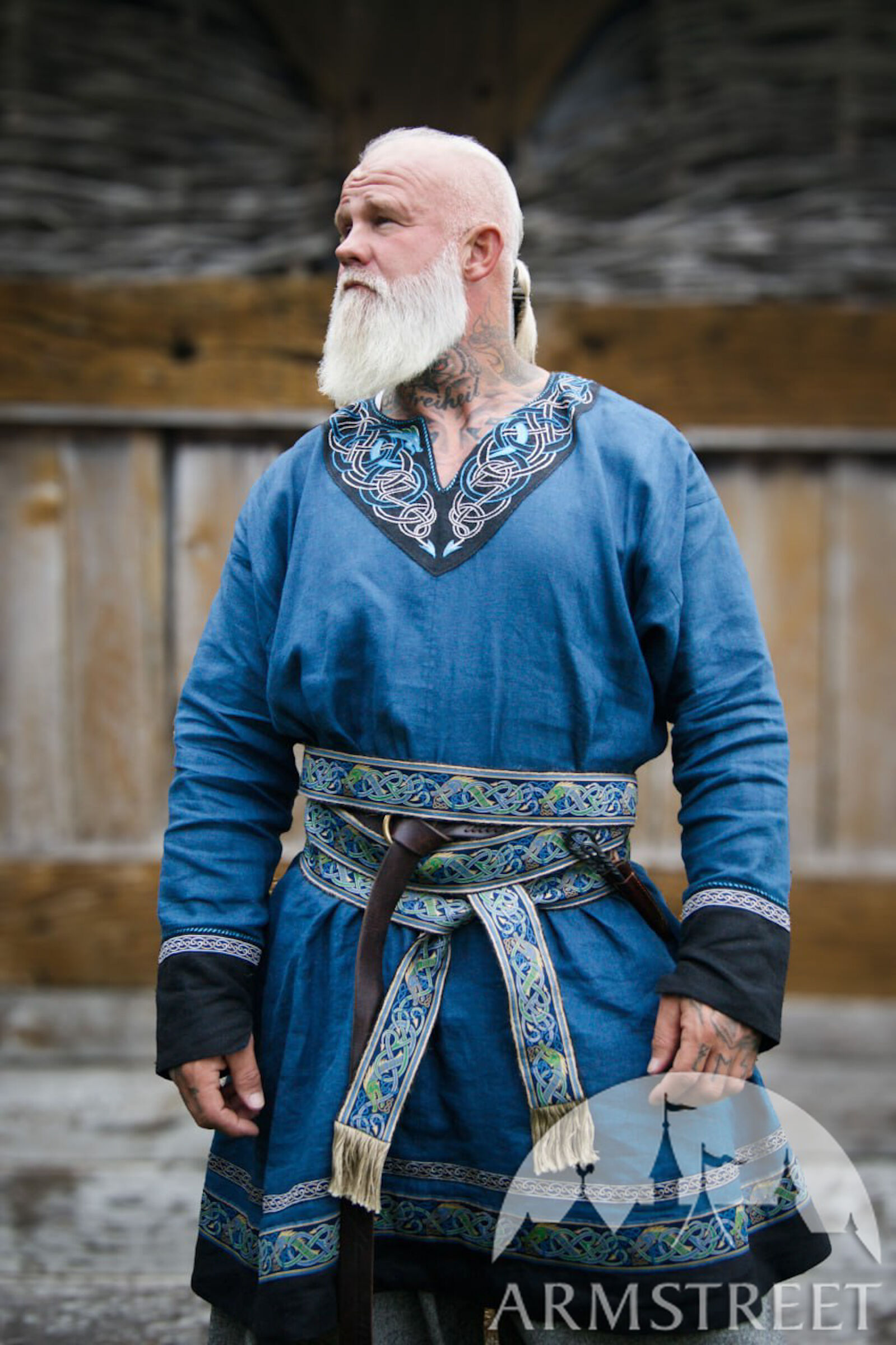 Our Viking collection keeps growing, featuring more genuine style clothing from the Early Middle Ages. This exclusive embroidered tunic is made of high-quality natural linen. The tunic's sleeves, hem, and neck opening are adorned with contrasting linen, trim and tiny details that all together create a multidimensional and complex textural and visual masterpiece. The decorative pattern features dragons, which are common in Scandinavian myths. This unique trim was specially designed and made exclusively for our Viking collection. The tunic's design is historically accurate and is based on discoveries made during excavations in Birka, Sweden.
