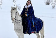 The cape is made of dense wool and decorated with fur, embroidery and decorative toggles is the ideal choice for long promenades, peregrination and journeys. Warm woolen fabric and fur edging on the hood will protect and ensafe you in case of bad weather. As the cape is not bulky, it suits perfectly well both for a walk and for a horseback riding. Three decorative toggles prevent it from flying open in motion, just the same way the classic flaring capes are fastened with the help of pin, fibula or agrafe. Additional comfort in motion is provided by small wooden buttons fixing fabric at the wrists securely. The character's style is finished by natural linen thread delicate embroidery framing the cape over the entire circuit. The gentle combination of colours and textures creates a fairy look which is romantic and cozy at the same time.