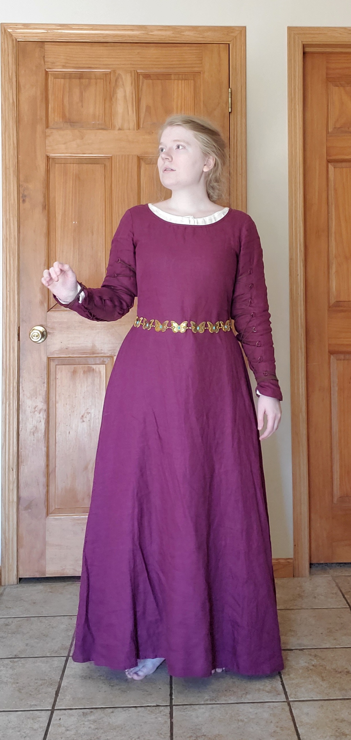 I use this as my basic chemise under a range of 14-15th century outfits. The shape is nice and slim to fit under different styles, and I like the adjustable neckline. However, I find when I tighten the neck it restricts movement through the arms/shoulders, and the sleeves become a little short. It still serves its purpose, however I just have to be careful depending on what I will be doing.