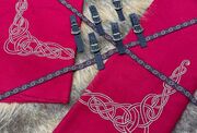 Kaftans were a popular item in dark ages clothing, usually used in combination with or in place of a cloak to keep the wearer warm. We have taken slight creative liberty with this piece, intending to create something that may not have existed, but COULD have existed in some stretch of the imagination. Our kaftan has a flattering cut and flows excellently when you walk, creating a handsome silhouette. To make this a truly luxurious kaftan, we’ve included some knot-work embroidery from the centre of the coat up to the buckles. The embroidery is quite neutral and is not meant to resemble any particular animal or pattern, and would go well with any of our other viking items.